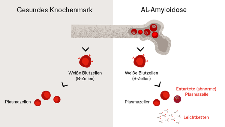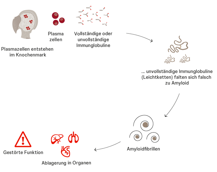 Immunglobuline werden im Körper insbesondere von sogenannten Plasmazellen gebildet, die aus dem Knochenmark stammen. Während Plasmazellen von Gesunden vollständige, funktionstüchtige Immunglobuline bilden, setzen die krankhaft veränderten Plasmazellen bei AL-Amyloidose vermehrt unvollständige Immunglobuline und fehlgefaltete Leichtketten ins Blut frei. Diese können sich dann zu schädlichen Faserklumpen zusammenlagern, den Amyloidfibrillen.1